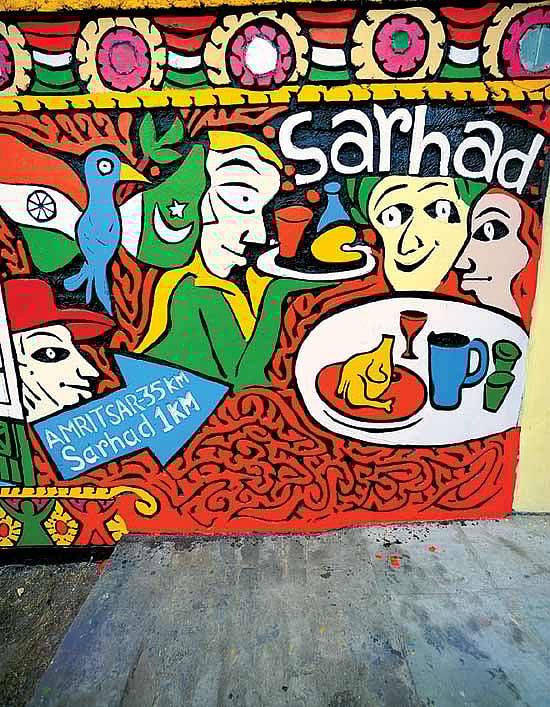 I pegged my hope of recovering from this misplaced display of nationalism on the more soothing ambience of Sarhad, a kilometre away from the Wagah border. Aman Jaspal, owner of the concept restaurant, ushered us into a contrasting world of accord. My eyes immediately fell on the intricate jali work segregating tables and the hand-painted live counters. Outside, two mini trucks had the signature touch of Pakistani artist Haider Ali, with his simple but busy style. Every aspect of Sarhad was a celebration of the architectural, cultural and culinary heritage of pre-Partition Punjab. Right from the food, furniture and furnishings, Sarhad synthesised the common heritage in the most heartwarming manner. Aman mentioned how he makes several trips across the border to engage artistes, designers and chefs to bring the flavours of Lahore to Amritsar. Even the restaurant&rsquos logo has a white pigeon surrounded by the word &lsquopeace&rsquo in 25 languages.