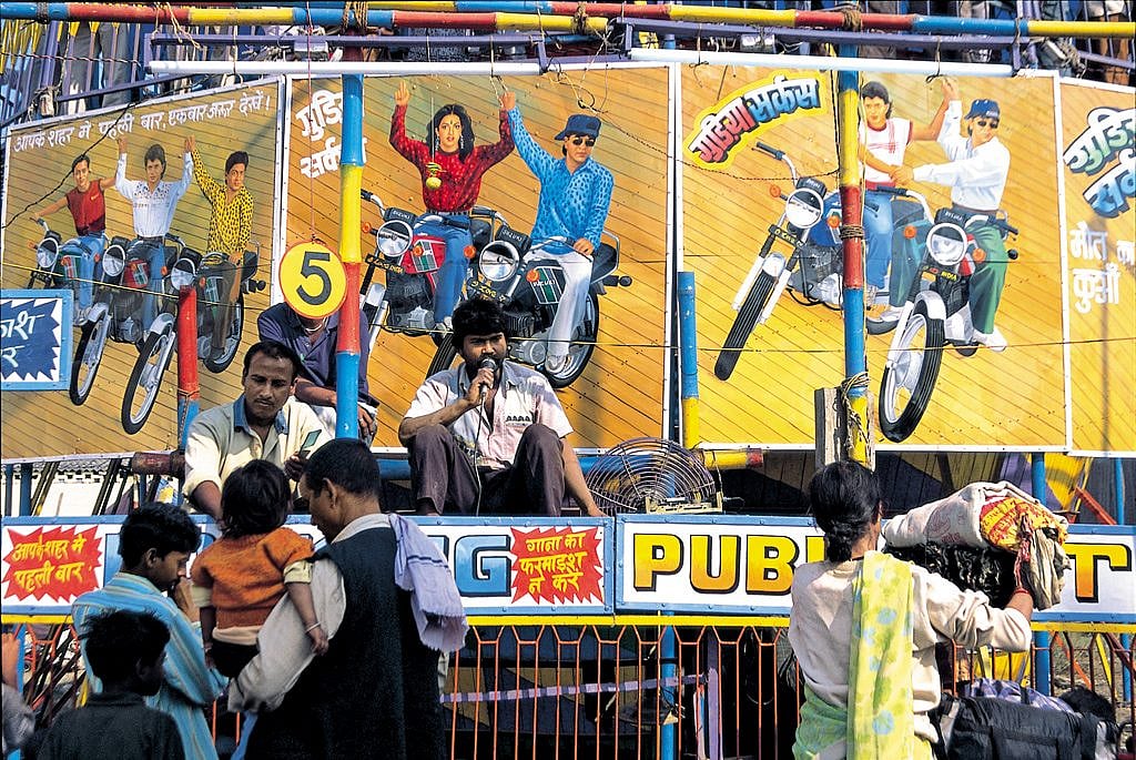 Throughout the mela, there is a purposeful but relaxed swirl and eddy as people make their way to and from the river ghats there are baths to be taken, traditions to be observed, and gods to be propitiated. Moving along with the bodies is a world in brass and copper bowls, spouts, plates, lamps and lotas make alliance with marigolds, threads, vermilion and incense. Near the ghats, satsang camps, ashram outlets and even a gurudwara from Patna, take the shortest route to mens heartsthrough their stomachswith bhandaras and langars of community food, and through their ears, using loudspeakers.