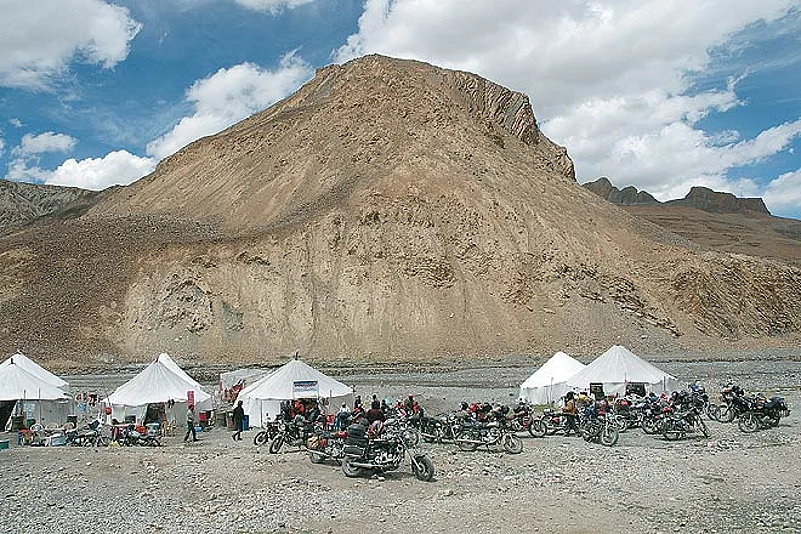 But the morning brought bad news. A few riders were quite unwell with high-altitude sickness, and were going to ride in the jeeps, with the RE mechanics riding their bikes. The organisers had provided for oxygen cylinders that came in handy, and there was a doctor riding with us. But one rider had to be taken to the military hospital in Pang, and then Leh. The value of the arrangements made by the organisers and the back-up never seemed as crucial.