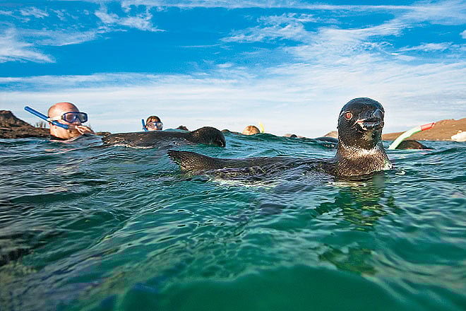 The Galapagos penguin is small, almost scrawny. While snorkelling, I think I see one perched up on the rocks above me. Before I can even blink, it dives into the waters and hurtles towards me, and then, a sudden 360° turnabout, and he&rsquos out of the water in seconds, making me wonder if I imagined it all. In the Galapagos, you aren&rsquot allowed to touch the animals, but there&rsquos nothing you can do if they come close to you. Bumping into a dinosaur (or is that a marine iguana) is entirely possible.
