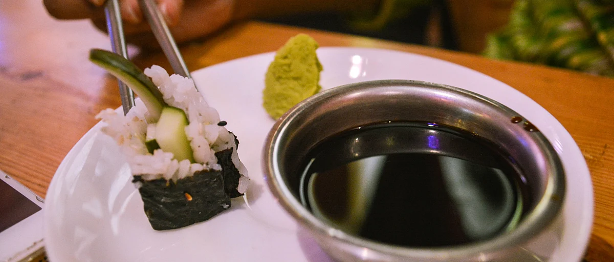 wallpapered walls, with Buddhist flags and Tibetan translations of books thrown into the mix. We ordered a 4-piece vegetarian sushi platter (Rs 130), but on knowing it was our first time in the area, the restaurant generously served up 12 pieces for the same price. While roughly made, the bite-sized cucumber and carrot maki rolls, California veggie rolls, and crispy veg rolls were the perfect afternoon snack. Finishing off our meal was a gigantic chocolate and walnut brownie (Rs 90) smothered in bitter chocolate sauce.