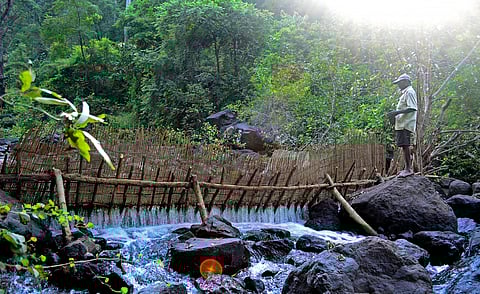 With that we set off on our walk to the Barda falls. It is a steep descent to the Barda Nallah, almost 1,000 ft through dense forest. On the way down Anil pointed out various trees "that's kodi, put two drops of its resin into goat's milk and you'll get the sweetest dahi in five minutes that's khandhor, the powder that flakes off it's trunk cures skin ailments etc." His knowledge was exact and detailed. A bit like the carefully designed fishing and hunting equipment I'd seen in the village houses, elaborately crafted bamboo traps to catch a particular variety of fish know as murra and the sticks coated with a combination of four different resins that are used to snare birds.