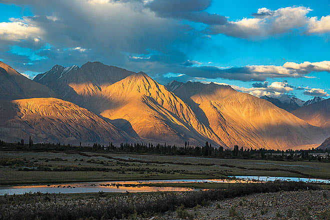 We made our way to the Nubra Valley for the second leg of our stay. As we wound our way up to Khardung La in a crawling convoy of dieselly vehicles, we looked left to see the entire Stok range gleaming in the sunlight. Phuntsog said sharply, Golden Eagle And there it was, a magnificent raptor gliding at us, framed against the mountains. We got out of the car to see it soar higher and higher still. It was joined by another and they circled the thermals in a beautiful dance, brushing past each other, their wings indeed golden as they filtered the sunlight.