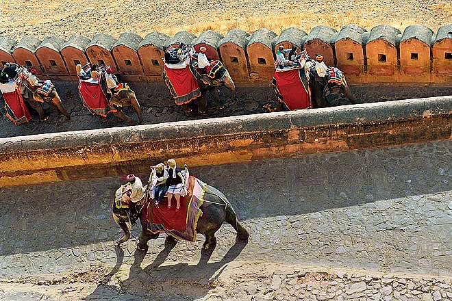 The place where an elephant ride really counts is Amer Fort (or Amber Fort), the former capital of Jaipur before the Pink City was built. The fort complex was described by the guide as &lsquothe jewel of Jaipur&rsquo, and we&rsquore happy to say the moniker is no exag­geration. The fort is, to use a hackneyed (but correct) description, breath-taking&mdashand that&rsquos even if you get there in a vehicle without doing the steep uphill walk. As soon as we entered the first courtyard, once the gathering place of soldiers, we saw the fort elephants arriving one by one from the other side, each carrying tourists who must have felt like minor royalty as they entered through the gate traditionally used by the kings.