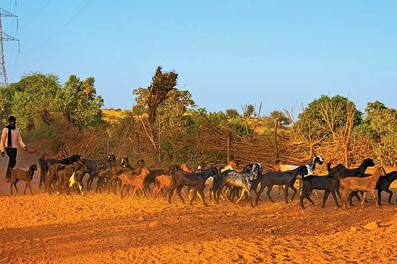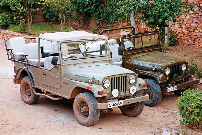 Another evening, Rajveer, Hemendra&rsquos soft-spoken brother who co-manages the property, took us on a &lsquovillage safari&rsquo in his jeep. After about eight kilometres of driving through some rugged terrain, we stopped at a small village. It was a stunning setting. Children were skipping stones quite expertly on the still waters of a creek bathed in the golden light of the dying sun. One of them was beating the water with a large staff (rural pastimes, I tell you). In the backdrop, a hill range loomed dramatically. Under the shelter of a small temple we stopped for tea. On the way back, in the gloaming, we caught a jackal in the headlights.