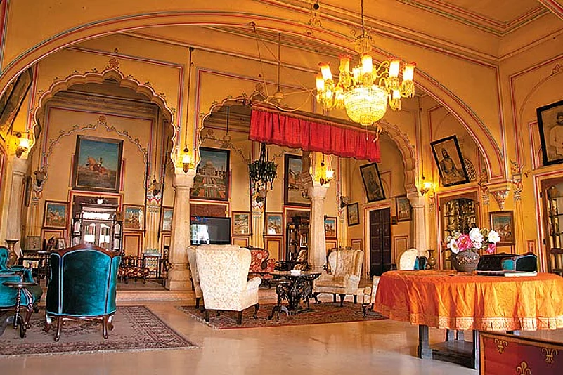 Leaving Jaipur, I turned on to the Agra road and swept through the Ghat ki Guni tunnel. A few minutes later, I swung my jalopy into the crowded lanes of Kanota, went past the formidable castle gates and parked myself at the edge of an impeccably maintained lawn. To my left sat the pleasing confection of a haveli, to the right a walkway over a moat led to the family temple. Across the courtyard lay the former Durbar Hall and what must now be one of the grandest living rooms in Rajasthan&mdashand which some will recognise as the setting of the Viceroy Club in The Best Exotic Marigold Hotel (the property also does a cameo in The Second Best Exotic Marigold Hotel). Cannons purchased from the British navy stood sentinel over the pacific scene. The unremarkable world outside had ceased to exist. The guest rooms, their walls painted with delicate frescoes to soften any residual martial vibe, were ranged round the perimeter walls. After I had checked into my spacious suite, complete with claw-footed bathtub, and rung for lunch, it was in the Durbar Hall that I settled down, right at home among the portraits, antique cameras, hand-swung pankah and three-way love seats, the brocade and the velvet.
