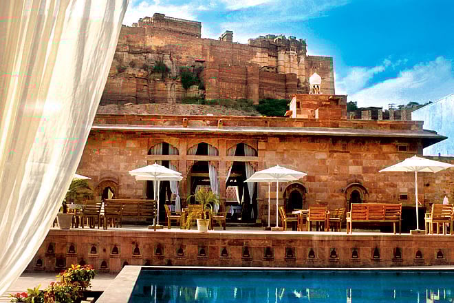 I will gush some more. In Jodhpur we stayed at Raas, a boutique hotel at the foot of Mehrangarh Fort that has made use of the enchanting trick of fusing old with new. The hotel is made up of three modern buildings and four old, with the oldest (the original haveli) having been built towards the end of the 18th century. The pillared and now glass-walled struc­ture that houses the reception area was dismantled before modern construction began, moved, and then reassembled where it stands today