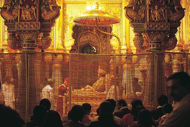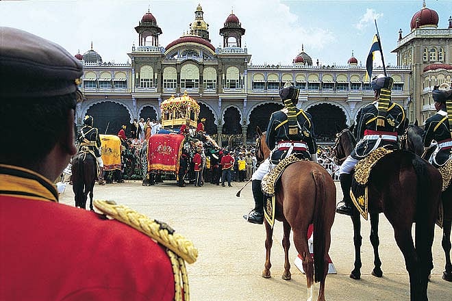 The next morning I wrangled an entry into the palace to watch the maharaja&rsquos ayudha puja on the penultimate day of the festivities, a ceremony that is closed to the public. By the time I argued my way inside the palace gates, the puja was in full swing. The maharaja stood on a dais, decked in flowing mauve robes, with glittering necklaces coiled around his neck and an exquisite turban on his head. A marching band provided romping, if somewhat incongruous, accompaniment to the rites. Camels, caparisoned elephants, palanquins and luxury cars passed before the king to each he made an offering of flowers before motioning that they be taken away. The band trumpeted on through &lsquoSerenade in the Night&rsquo and &lsquoThe Cariappa March&rsquo, before ending with a rousing rendition of the Mysore anthem.