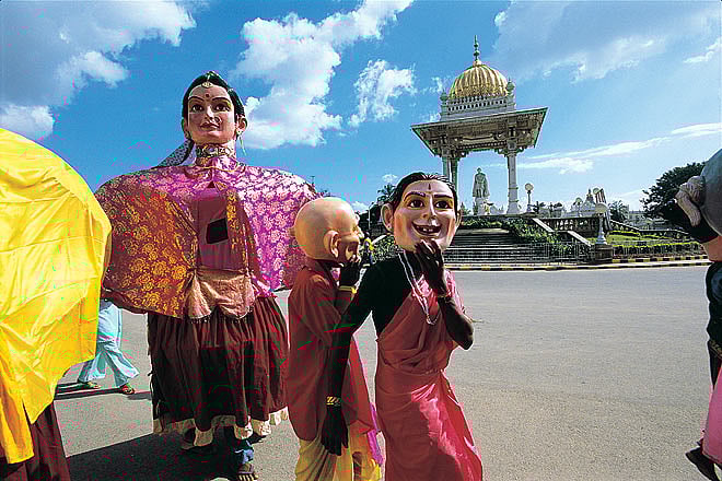 The range of cultural forms showcased in the procession was staggering&mdashDollu Kunita, giant Garudi puppets, Shaivite Veeragase dancers, Pata Kunita, Nandi Dwaja.... These were interspersed with tableaus, some celebrating the wonders of Mysore, others freezing moments from the epics, still others celebrating the diversity of religions. My favourite tableau was one warning against the evils of alcohol. A man took a swig of what looked like rum, and pointed menacingly at his wife. She protested feebly. The vehicle moved a few feet forward where the man took another swig of rum, and the woman protested feebly again. I marvelled at the stamina the two actors would need to live in this fleeting theatrical rut for the next three hours, as the glorious Jambu Savari wound its way through the streets of Mysore.