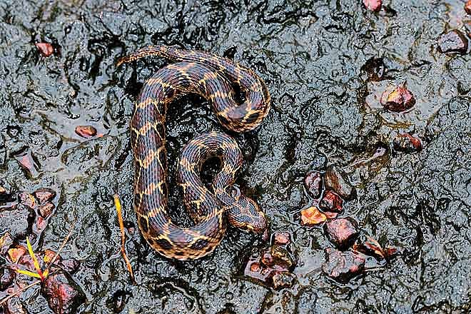 But Omkar is a seasoned hand. Right inside Nature&rsquos Nest campus, he unearthed a gleaming Hump-nosed Pit Viper (Hypnale hypnale), its scales overlaid with a double row of dark spots. It wound and unwound itself, so beautiful in its languor, but we kept our distance, knowing its reputation for being aggressive and irritable. Its venom causes fatal kidney failure. Everyone breathed easier when it retreated to its resting place.
