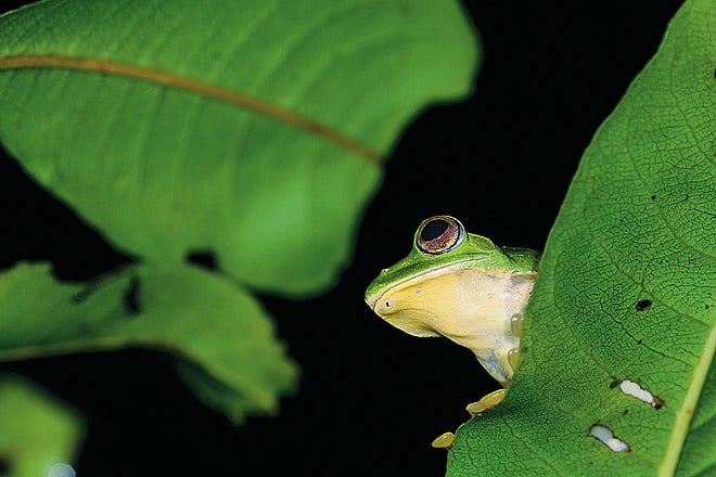 Moving up into the reserved forest area adjacent to Nature&rsquos Nest, Omkar led us to a plateau studded with laterite boulders glistening purple after the night&rsquos soaking. Suddenly, like a dream one, two, five, a full 16 wild boar rumbled across our path in a mini stampede. Then, somewhat surreally, a shocking pink tree crab sauntered across our path, a hundred kilometres away from the sea. Followed soon after by a proliferation of frogs the skittering frog, the reddish burrowing frog, the Malabar gliding frog, the Amboli bush frog, the common Indian toad.