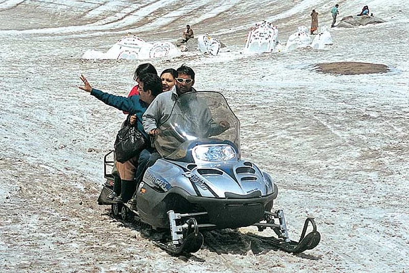The Snow Point near the Rohtang Pass is undoubtedly the real thing. There are very many snow scooters here, innumerable skis and skiing experts to hold one&rsquos hand down the slopes, stalls selling tea and chowmein, even two melancholic yaks unmoved by all those ecstatic about being photographed touching their curving horns. Snow sledges called &lsquoBablu Express&rsquo and &lsquoRaja Hindustani&rsquo take tourists up the slope to a temple and back, while photographers flaunt dog-eared albums to compel much-in-love couples and families to pose for a small fee.