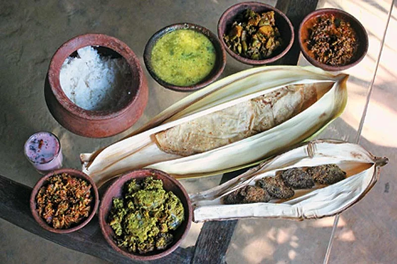 The interactive kitchen Randhap (Mal­vani for &lsquocooking&rsquo) was where Mrs Priya Samant gave her cooking demos. Vegetables were chopped on a traditional cutter called adalho while farm-fresh organic vegetables and seafood were prepared on a chool (mud stove). Food was served in earthen pots and patravali (leaf plates) in the dining area called Pavhner. For break­fast, we had masala sandhan, a yellowish idli of toor dal with turmeric and coconut, and a troika of poha &mdash tikat kanda pohe (spicy onion flavour), gode pohe (sweet jaggery version) and the delicious kalo lele pohe, seasoned with ghee and live coal that imparted a smoky flavour