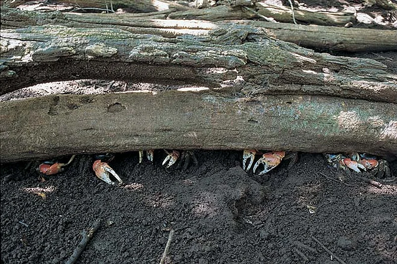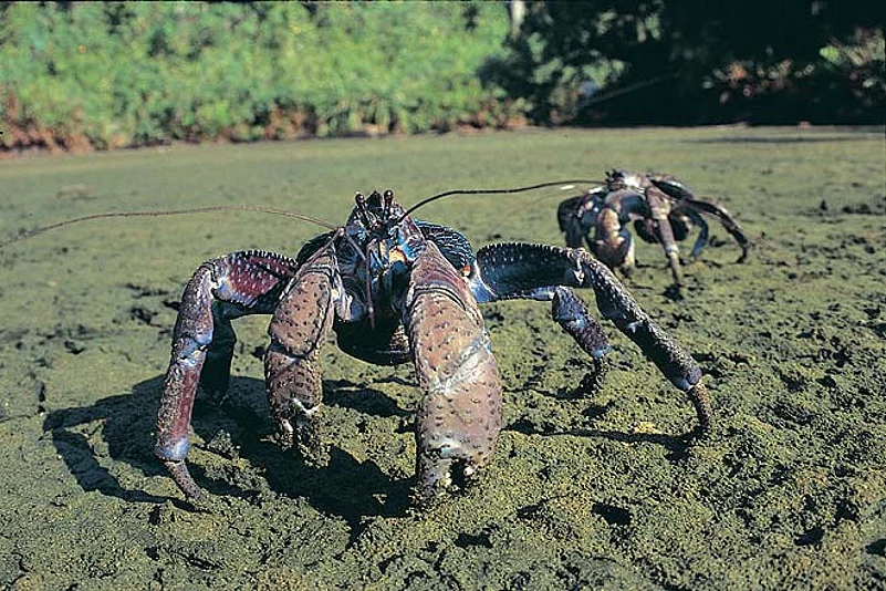 Smack in the middle of the island was a large circular clearing with an island of beautiful palms and tiger ferns. It looked as if someone had manicured it to make it look just right. We soon found out why the area was clear&mdashit was a tidal swamp. When the tide came in, seawater seeped up from underground and filled the clearing. When the tide went out, the pond drained to become a clearing once again. We found several enormous coconut &lsquorobber&rsquo crabs, the largest land crabs in the world, milling about in the clearing. While we stood there silently taking in the vision, I felt something tickle my ankle. It was a coconut crab checking me out, its antennae quivered with unfamiliarity. Schwete tactfully grabbed the crab behind and held it up for me to take a good look. These purplish 10-legged creatures have seen so few humans that they were probably curious.