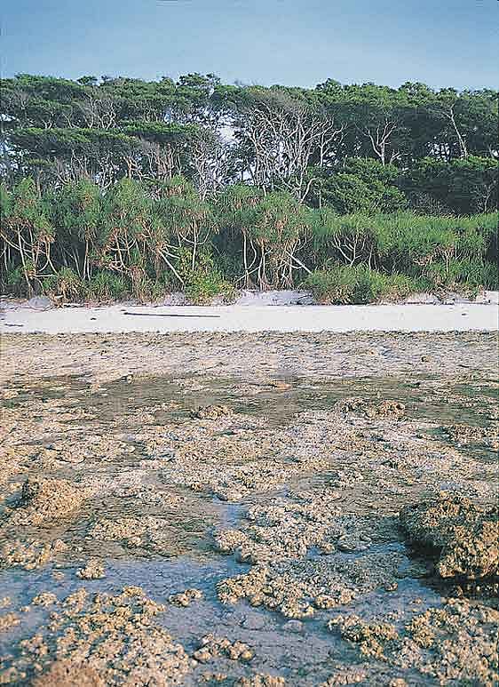 At sunset, the tide was going out and I explored the tidal pools among the coral reefs. Live cowries glided slowly by, a big black crab with bright red eyes scampered away, a five-foot spotted moray eel zipped past my legs as I lifted the rock it was hiding under. Gobies and more colourful crabs than can be listed here, and starfish foraged among the rocks. Johnny, who was diving under the surf nearby, came up and presented me with a big gorgeous live cowrie. I was touched but tried to tell him gently that I don&rsquot like to take live animals. I felt bad rejecting his present&mdashhe was only trying to give me a gift in return for the cap I had given him earlier.