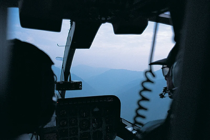 Finally, juggling visibility, permits and budget, we draw our lot. Seat belts are on, earphones and their button-pressed speaker have been tested, even poo-bags are at hand. Captains M.L. Gupta and Shriram Ayagiri welcome us on board. On both sides of the five-seating passenger area are windows, one of which opens up for some mountain air or that perfect picture. The ground falls away beneath our feet and in a moment Gangtok&rsquos pasta roads and matchbox houses pop out from the green as thousands of colourful da-cho flutter like butterflies on the hillside, letting the lungta or airy-horse carry the luck of the individual who foisted it in every direction.