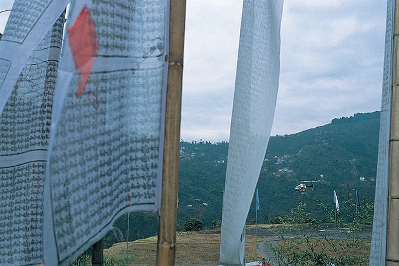 Sikkim&rsquos helipad is in Gangtok&rsquos Burtuk area, right next to the fluttering white cho-pen of the charming Burtuk Mani Lakang .On the surrounding slopes, passersby squat to take in the sun and watch the fun as unsuspecting passengers in saris parachute on the tail wind. In the vast, plump-sofaed waiting room is a counter offering the best of Sikkim Distilleries, Sikkim rum to crème de menthe, protective wooden dragons and the light, flavoured Temi tea. Around the Mani Lakang, little lamas from the nearby Tibetan School, some as young as five, are at play while Sruti Mishra, six years old, d/o ITBF soldier, prefers to watch the copter.