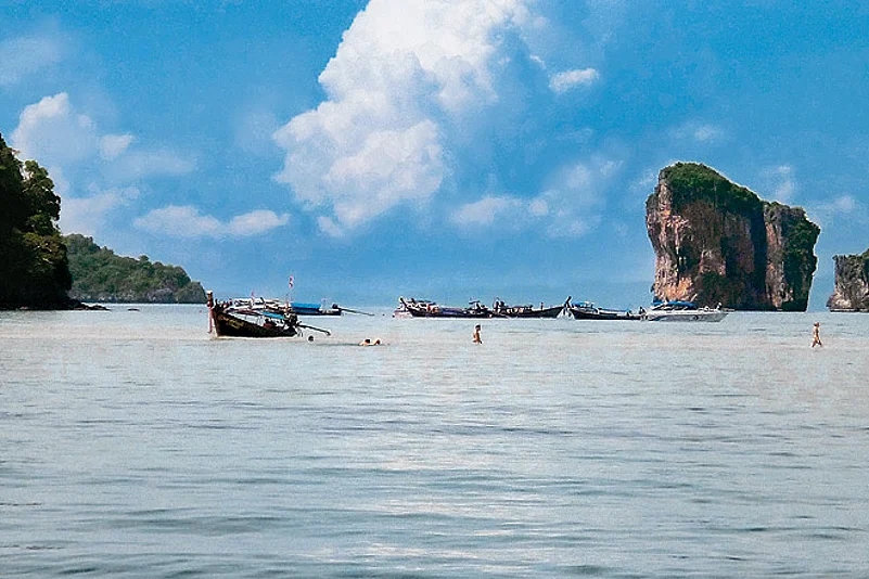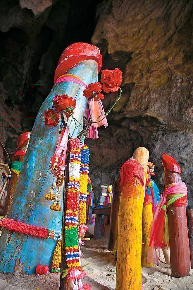 Lunch at Rai Leh beach includes a delicious tom yum soup and barracuda with vegetables, after which we are ready to island-hop again. This time, it is to the heart of the creation myth that explains this incredible topography. Phra Nang is the cave of the promised princess, around whose petrified wedding guests we have been boating, swimming and snorkelling. The cave itself is clearly a place of fertility wish-fulfillment. I am momentarily stunned, and then intrigued by the hundreds of phalluses in the shrine. They are of wood, some beautifully painted and finished, others rudimentary and weathered, piled over rocks rising high into the cave. Unfortunately, reports of a storm make it necessary to leave immediately, and the speedboat races incoming rain to Ao Nang beach. There, I am made happy once again by the purchase of a sweet-sounding, eleven-chambered reed flute from an old man on the beach.