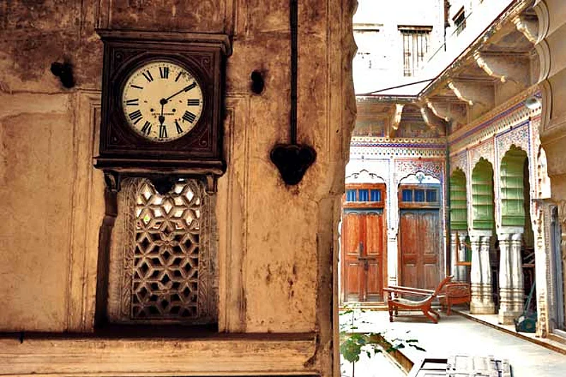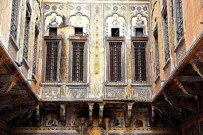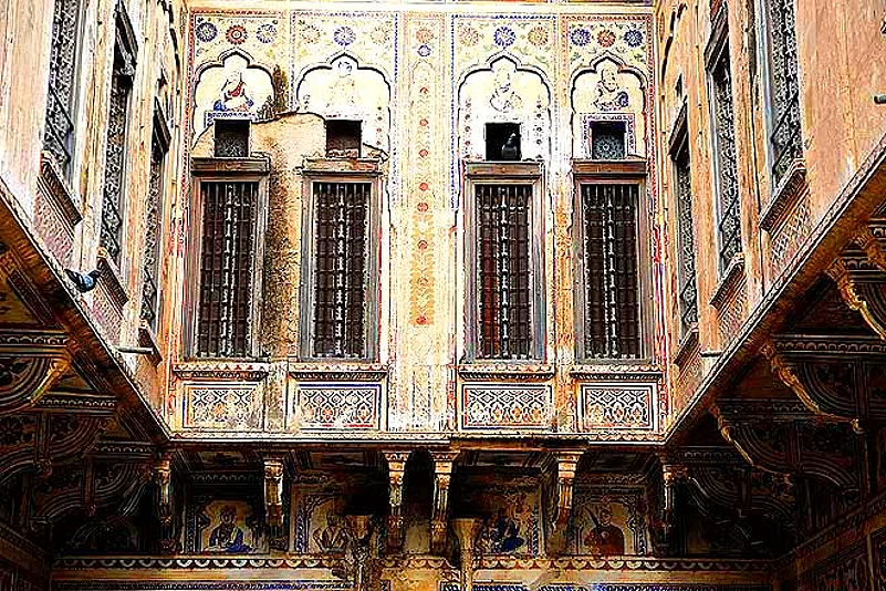 The following day, we started on our journey to Nawalgarh, a few kilometres from Mandawa, after a hearty breakfast of puri sabji. Nawalgarh was a dusty old town, probably looking almost the same as it did a hundred years ago. The first haveli we went to was the Koolwal Haveli. At this point of time I had no idea what to expect &ndash it was a 140 year old abandoned structure entirely covered in frescoes. The front porch was huge and was covered with family portraits of the past five generations of the family. I was gaping at these portraits when I noticed something quite peculiar &ndash the portraits of all the women of the family had their faces scratched off. My enquiries were in vain, nobody was ready to explain. The haveli was a double-storied structure with two courtyards on the ground floor. The outer courtyard, I was told, was only accessible to the men of the family. It was here that they would conduct their business the women were only allowed to watch the activities from the second floor, through tiny ornate windows or jharokhas. The second courtyard was for women it was surrounded by a kitchen, store rooms and a tiny room which was only used for storing water. The walls of the house were covered with beautiful frescoes and murals which depicted mythological scenes from the Ramayana and the Mahabharata. They were so detailed that it took us almost an hour to go through them all.