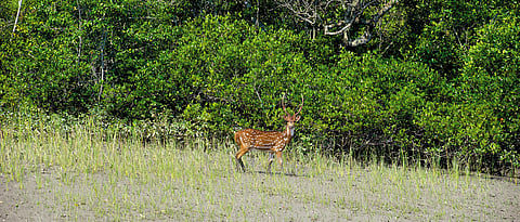 I had travelled by road from Kolkata to Godkhali, and from there by launch to the island of Bali, which is separated by the Gumdi channel from the 4,264 sq km Sunderbans National Park. Land areas of the forest are forbidden to visitors, and the netting maintained by the forest department that marks areas facing villages is visible along the left bank. The guide says that the net is maintained even where villages are separated from the forest by miles of running water. The island of Bali is one such area.