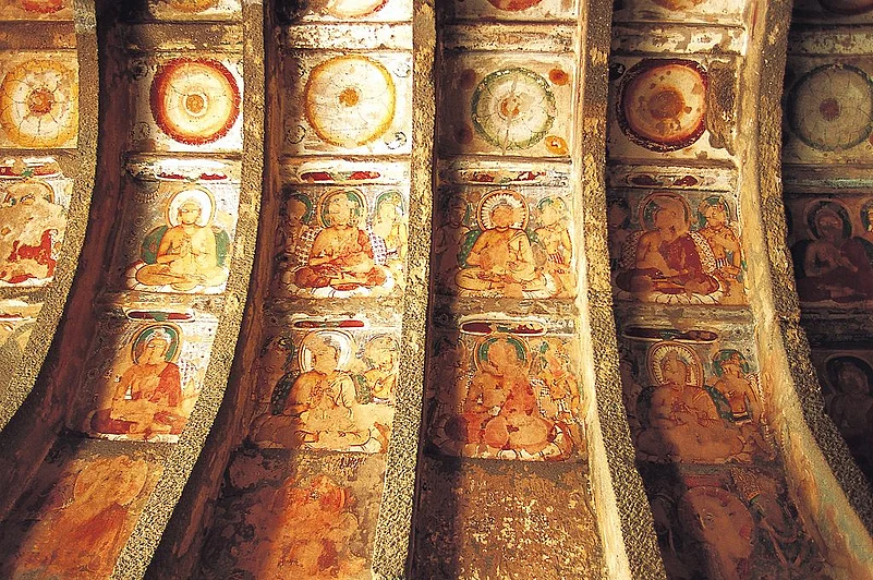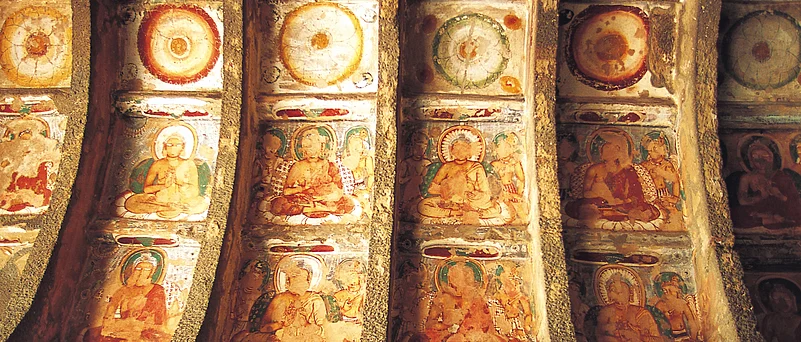 The 30 monastic caves and prayer halls were begun in 2 BCE, when Buddhism was alive and well, and completed between 460 and 478 CE under the Vakataka dynasty. The monks who lived in this sweep of hill meditated in their painted caves, drew their water from the stream, and watched monsoon rain cascade in waterfalls between the caves. For a brief time, Ajanta was a beacon of glory in the Buddhist world.