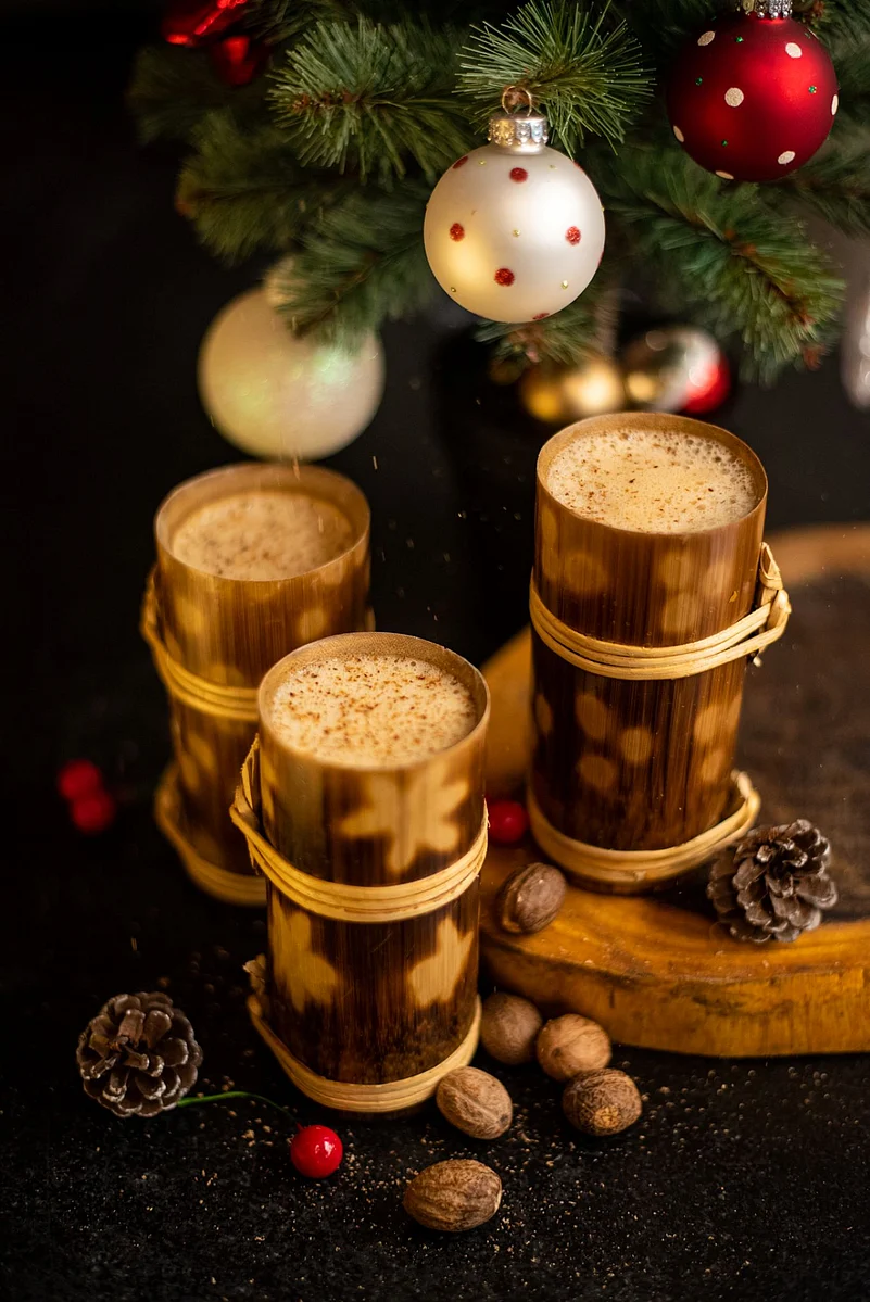 to a gentle boil. Then simmer it for 10 mins. Strain the beer mixture. Beat all the 5 egg yolks, adding sugar at regular intervals. Beat the mixture until thickened.Add the egg yolk mixture to the warm spiced beer and gently heat it. Gradually add the blocks of butter & allow them to melt. Remove from heat. Add Whisky/Cognac to the glass before serving. Garnish with grated nutmeg.