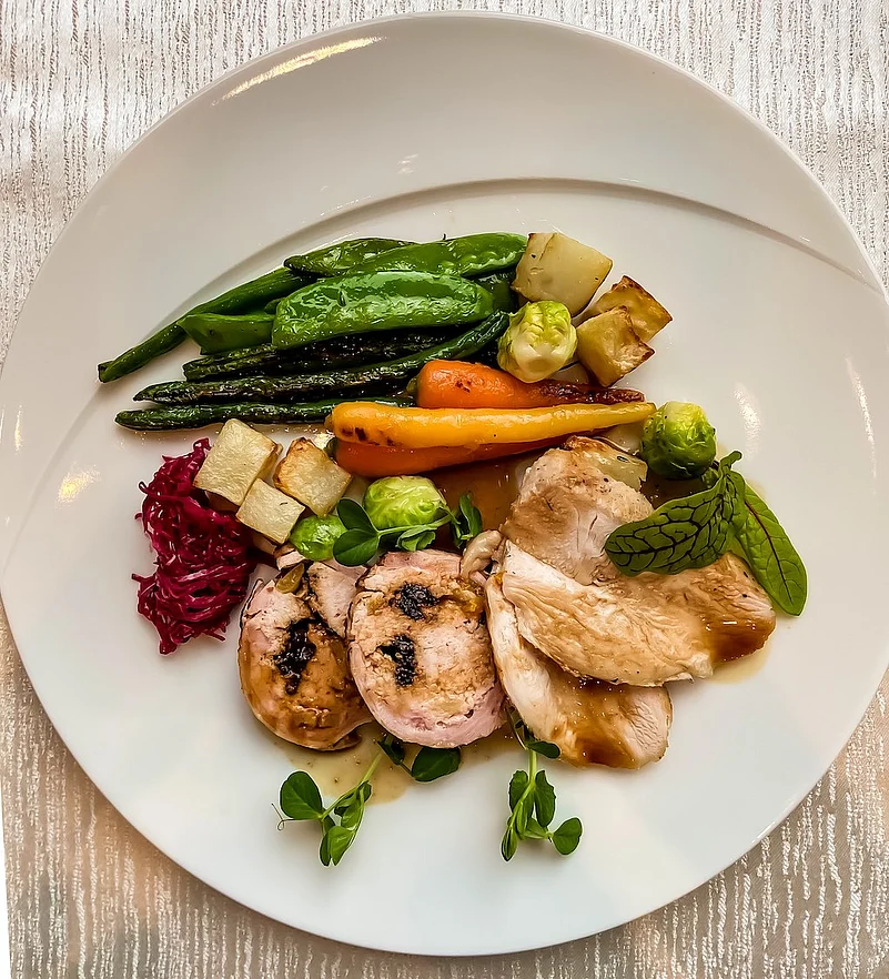 Blanch, roast vegetables in oven for 10 minutes at 180 degree celsius. Removing the Leg bone and breast bone from a whole turkey makes it cook faster. Insert the knife between the breasts from top and go along the carcass of the breast. Snap the shoulder joint from the turkey. Take the breast, put it in sous vide bag with herbs, seasoning, butter and cook it in water bath for 1 hour at 65 degree celsius. Before service take it out from the bag and sear it from skin side only. Insert your knife horizontally along the top side of the thigh. Slowly separate the meat from the bone. Once the thigh is deboned, start stuffing with turkey mince, dried fruit, seasoning, give round shape to the leg with the help of food plastic wrap and put it in sous vide bag along with butter. Cook it in water bath for 1 hour at 65 degree celsius. Before service take it out from the bag and sear the roll from the skin side only.
