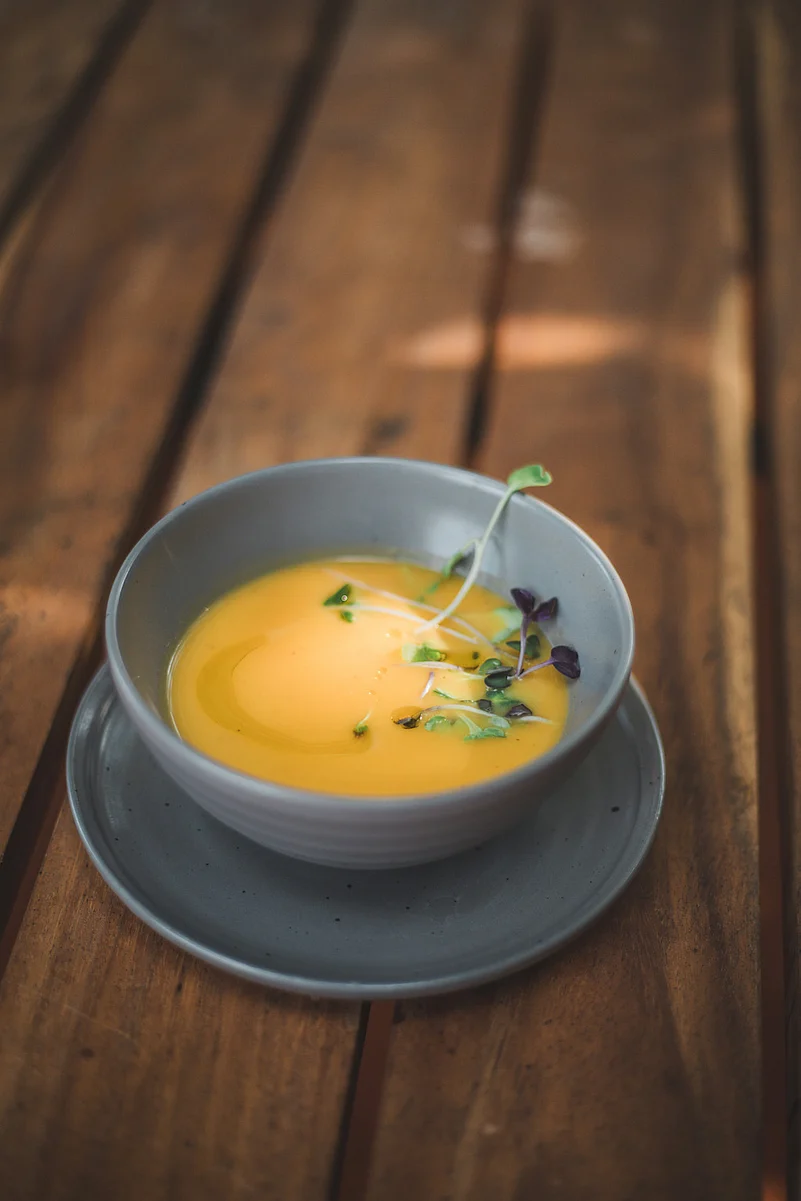 In a pan heat the oil. Add the star anise, cinnamon stick and coriander seeds, sauté for a minute. Add the thyme and continue to stir. Add the chopped garlic and saute for a minute. Add the chopped onion and saute till translucent. Add the sweet pumpkin and make sure you dice the pumpkin into medium size pieces. Add salt. Once the pumpkin is slightly sautéed add the orange juice. Let it come to a boil and then reduce the flame to a simmer, and cook the pumpkin till it is completely soft. Takes about 15-20 mins for the pumpkin to get soft. Take out the star anise, cinnamon stick and thyme leaves once the pumpkin has cooked fully. Blend mixture into smooth purée. While assembling, heat the puree with a ladle of vegetable stock and 5ml white wine and bring to a slow boil, check the seasoning and turn the gas off.