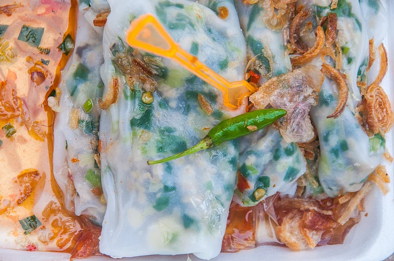 Steamed rice crepes filled with wood ear mushrooms and ground pork, often seasoned with white pepper, banh cuon are an excellent breakfast meal that covers all bases. It's filling but not heavy, peppery, but not too spicy. The dish translates to "rolled cake" and originated up North but is prevalent throughout Saigon. Each bite can be dipped into a sweet fish sauce with as much chilli as possible.
