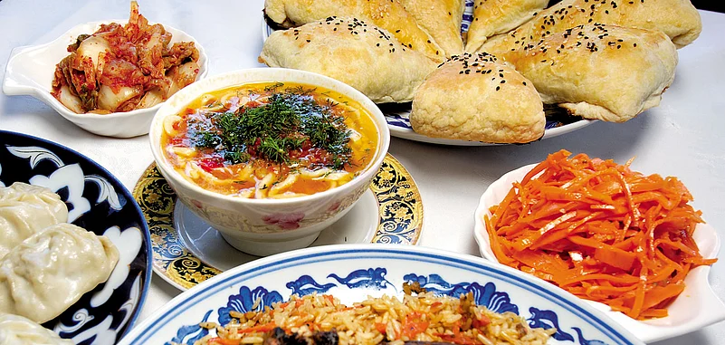 At every meal the Uzbek dastarkhon is a profusion of colour. The non (naan) and kuk choi (green tea) are constants, and so are thickly sliced tomato, cucumber, onion and sprigs of herbs, especially basil, parsley and dill. Regional variations aside, mornings typically bring porridge, shurpa (rich consomme), cold cuts, along with an assortment of fresh cheese and yogurt&mdashkatyk, tvorog, smetana, kaymak or suzma&mdashto the table. The national dish, plov, usually by itself or with kabab/shashlik is a lunch standard, whereas dinner means a hearty multi-course. The anytime choices are manti (steamed dumplings), somsa (savoury flaky pastry), dimlama (stew) and lagman/norin (noodle/pasta in broth). Mutton, beef and horsemeat make it to the ingredient list but chicken is scorned at. The servings are large-hearted and preparations&mdashin sunflower or cottonseed oil&mdashhave rustic robustness not complex, mildly seasoned, served fresh and immensely flavoursome.