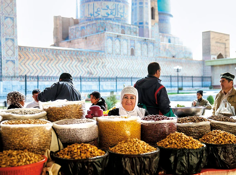 Siyob bazaar sits adjacent to Bibi Khanum Mosque, whose construction was ordered by Timur following his Hindustan conquest in 1399 CE. It&rsquos seen better days and was once the largest in the Islamic world. A little ahead is Uzbekistan&rsquos jewel in the crown, the 15th-century Registan, a complex of three madrasas Ulugh Beg, Tilya- Kori and Sher-Dor. The square is truly compelling and colossal. Once the heart of Samarkand, public announcements were made here, caravans halted and wares were bartered. It&rsquos been a tad too aggressively restored, a pattern seen across monuments in Uzbekistan, and the blue mosaic is perfectly in order.