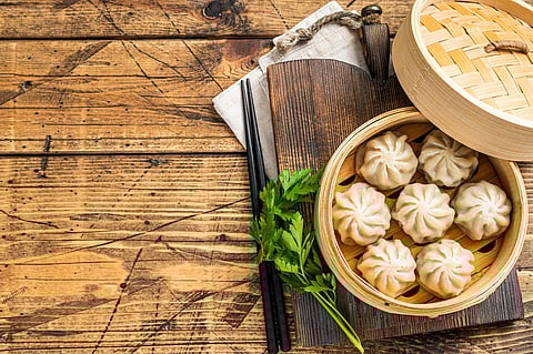 Take mutton keema along with mutton fat, and mix chopped onion, butter, ginger garlic ,hot oil and salt. Rest the mix for 10 minutes. Meanwhile, for the dough take refined flour and water for a fine mix. Place the mutton mix inside the dough and fold neatly. Steam in a momo steamer for about 8 to 10 minutes. Serve with sauce.
