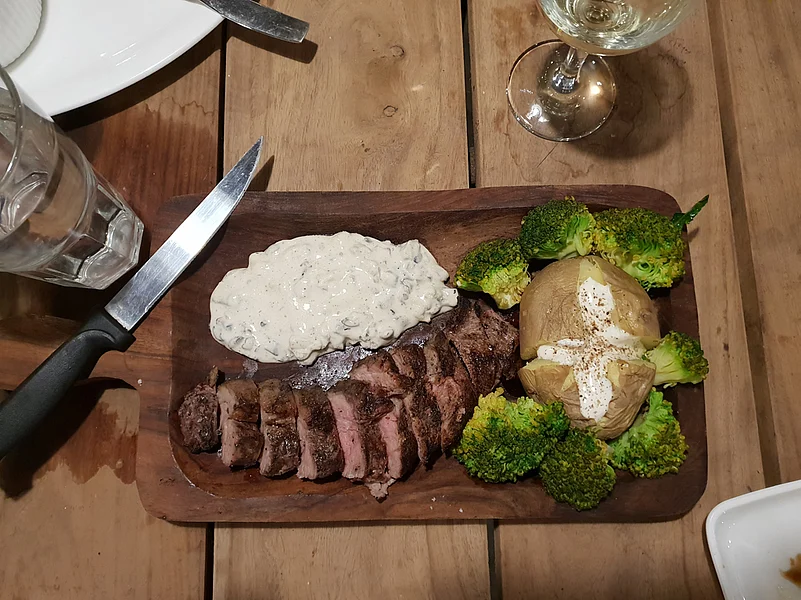 However, an absolute show stopper was the entrée of steak, flawlessly grilled to a pink from the inside, and accompanied with a creamy mushroom sauce, potato stuffed with cream cheese and butter and with broccoli to round it off.