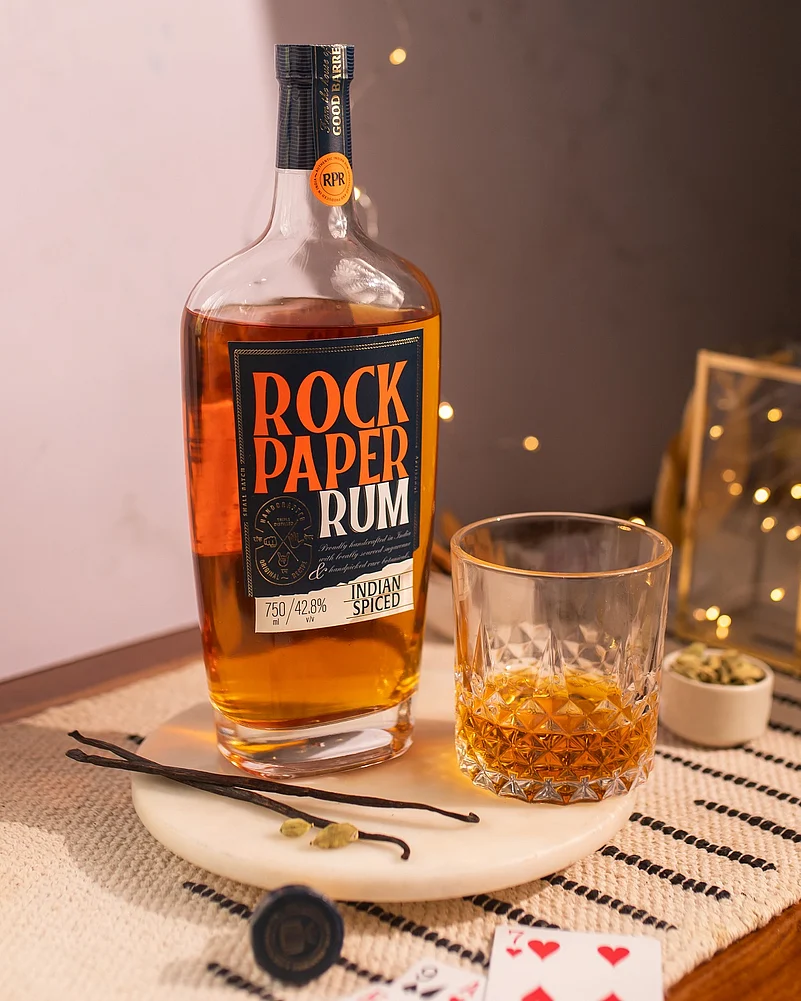 Rock Paper Rum Inspired by the classic game of taking a chance, Rock Paper Scissors, this is a tribute to the risk takers who are changing India as we know it. Craftily made with locally-sourced sugarcane and artfully blended with rare botanicals, this rum is made in small batches. This triple-distilled rum made with a rare blend of botanicals upholds interesting notes, with an unwavering focus on quality. It&rsquos disruptive, and sports a bold, playful and punchy attitude with a sense of being premium yet affordable.