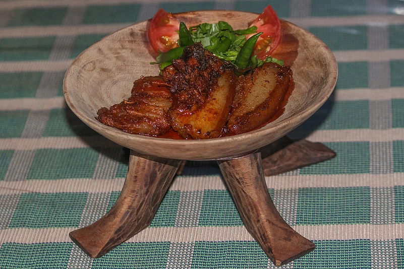 Pork with bamboo shoot, or we might as well call it the state mascot, is no stranger to most people. The craze for "Naga food" is sometimes unbelievable, which brings me to this question, "What makes this dish so popular" The answer lies in the ingredients and the art of combining certain herbs and spices with meat and bamboo shoot. No oil. This bamboo shoot that I speak of, is easy to make--chop some bamboo shoot, stuff them in an air-tight container and wait four to five days, wait longer if you want it more sour.