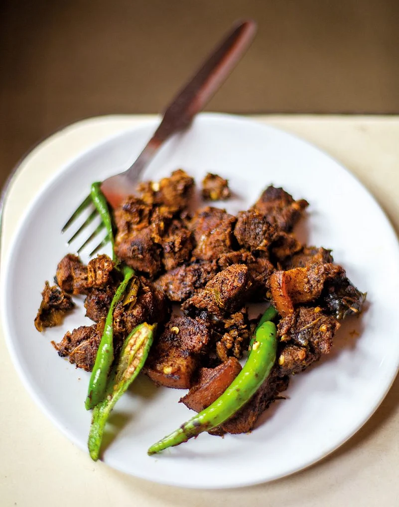 Pandi curry is a semi-gravy dish of tender pork cubes seasoned with the signature black kachampuli vinegar. The vinegar, which is unique to Kodagu cuisine and is said to have a shelf life of ten years (and gets better, thicker, tangier the older it is), is believed to preserve meat, reduce cholesterol and kill stomach parasites, though according to food scholar K.T. Achaya&rsquos learned books on Indian cuisine, its primary purpose is to keep the pork fat firm. To achieve the perfect result, pork is usually twice-cooked, first in a pressure cooker and then fried in a peppery masala, and purists would insist that it be had with kadambuttu(steamed rice balls) or akki otti(flat rice breads).