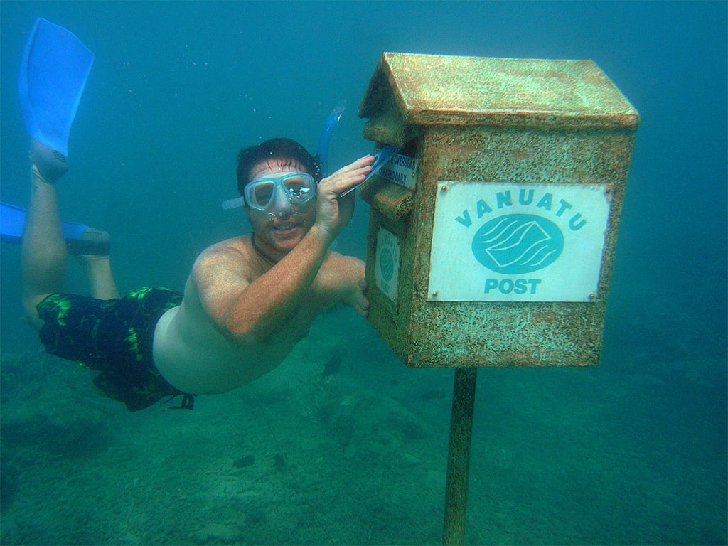 What does one do after successfully completing their first scuba dive At Vanuatu, a Pacific island nation located off Oceania and Australia, brag about the achievement in a postcard home, of course. The first underwater post office on Hideaway Island, this one allows anyone willing to swim among the fishes post mail on specially designed waterproof postcards.