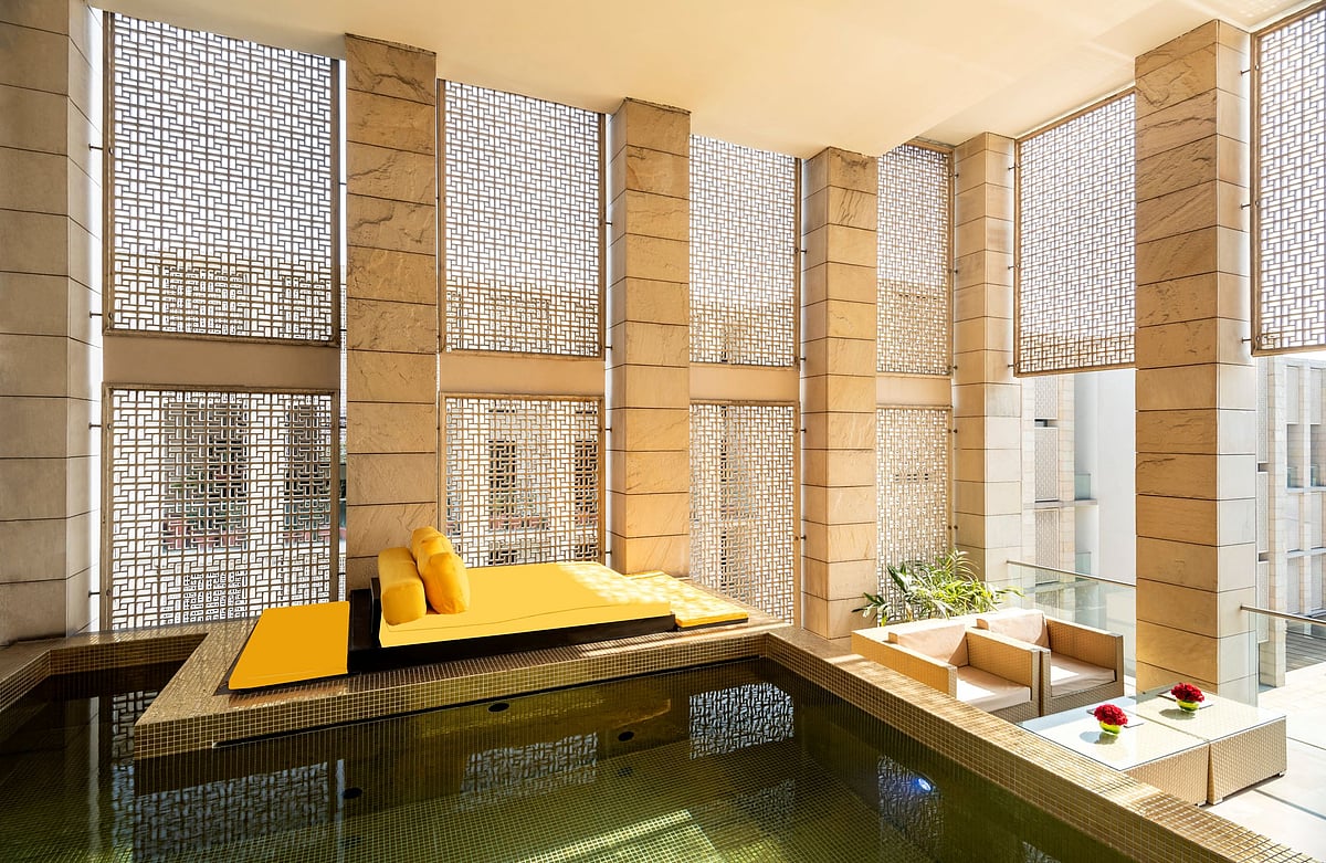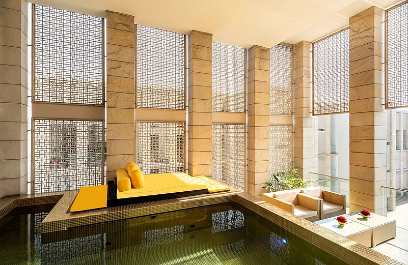 The sumptuous suite occupies 5,300 sq ft of the top floor of the hotel and commands sweeping views of the swimming pool and maze garden. Natural light flows through the master bedroom and adjoining twin room, the private dressing room, comfortable living and dining areas, private study and pantry. There is a heated outdoor pool and a terrace with views of the Gurgaon skyline. Eclectic modern artworks abound adding a touch of class. The living room includes a comfortable seating area furnished with sofas, chairs, a large coffee table and side tables. The luxurious bathroom is finished in Botticino marble.