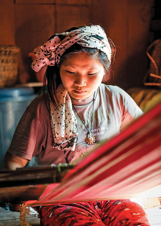 We were sitting in a raised longhouse, wood-framed and thatched, with bamboo slat floors. Pigs and chickens occupy the crawlspace below and polish off any food swept through the cracks. All around me were exquisite samples of bam­boo and cane weaving baskets, trays, stools, containers for hanging meat from the rafters&mdashall objects of daily use. The women wore beautiful sarongs and scarves that they had woven themselves.