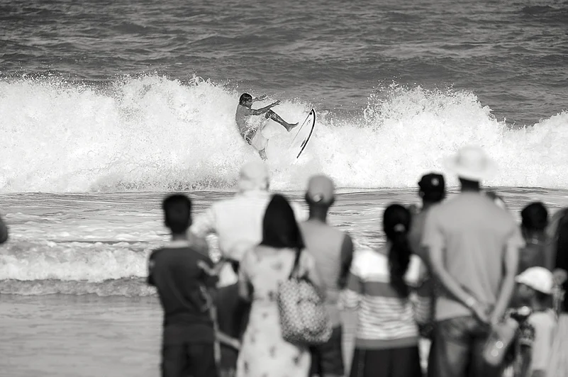 It was the day of the semi-finals and finals. Footprints again dotted the sand as the crowds sought out the best views. The crabs chose to hide. Drones flew over, loud music played and the emcees cheered everybody on. The finals of the womens category saw the youngest of the finalists, 16-year-old Aneesha Naik, win hearts when she came out of the water mid round and hugged her mother. Fisherman Sekar Patchai (first in the mens SUP and Seniors category surfing) performed outstandingly. Jonty Rhodes, famous South African cricketer, surfer and an ambassador of the SFI, was present too to encourage the participants. Many of them rode waves and performed complicated manoeuvres that brought them closer to a perfect score. Skill, presence of mind, precision and eleganceall were on display.