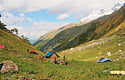 For us, the closest access route to Kanasar lake was through the Panchodar valley, which lies to one side of the Nalgan valley. The Panchodar valley is pristine, thanks no doubt to the fact that it is so seldom visited. Quite near the place our team had intended for the campsite, three bears showed up fortunately they moved on soon, bored of our affairs. On day five, as we gained height, we passed through endless meadow stretches strewn with tiny purple and yellow flowers. We tried our best to avoid hurting the pretty young things, but that was a futile exercise &mdash the meadows were carpeted with flowers. At the end of that day, we camped at Bijori (3,950m), which offered an almost-panoramic view of the surrounding heights.