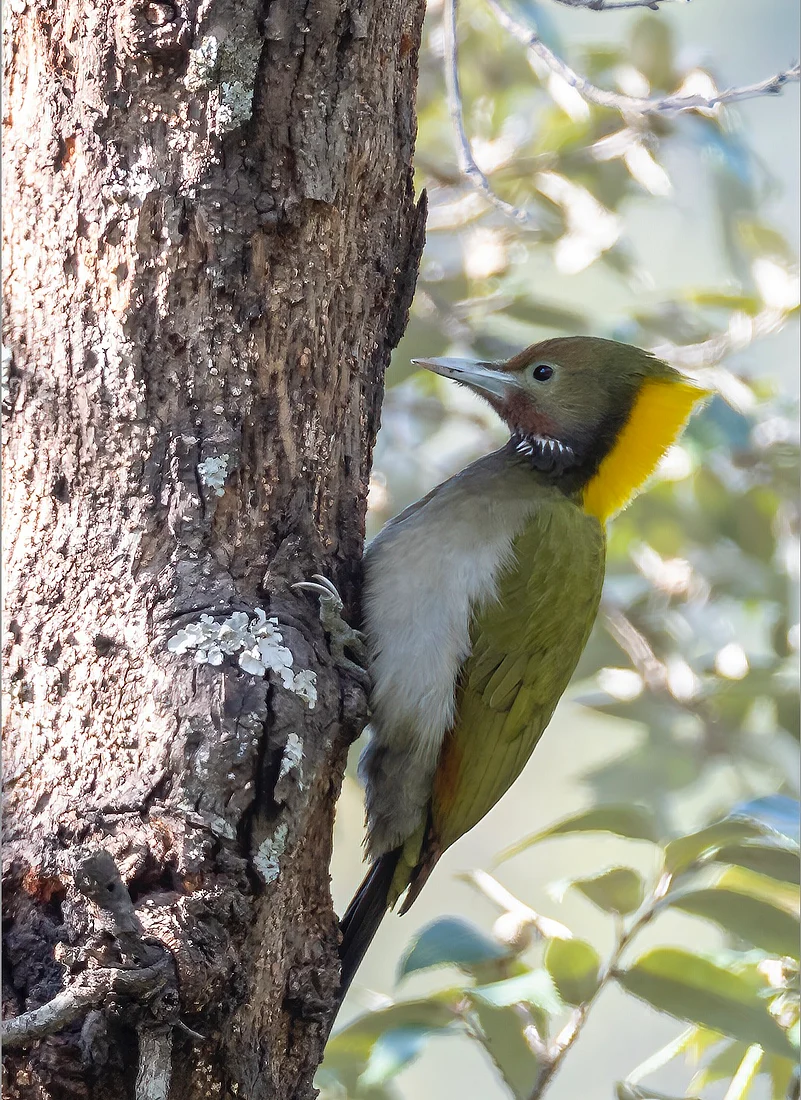 Mighty happy with the find, we walked further, with my guide informing me about all the varieties of birds that one can see here. Though I was listening to him, my mind was elsewhere as I could hear a constant drumming sound from nearby. Looking through my binoculars, I saw two woodpeckers knocking away on the trunk of a tree. They were none other than the Greater Yellow Naped Woodpecker and the Brown-fronted Woodpecker.