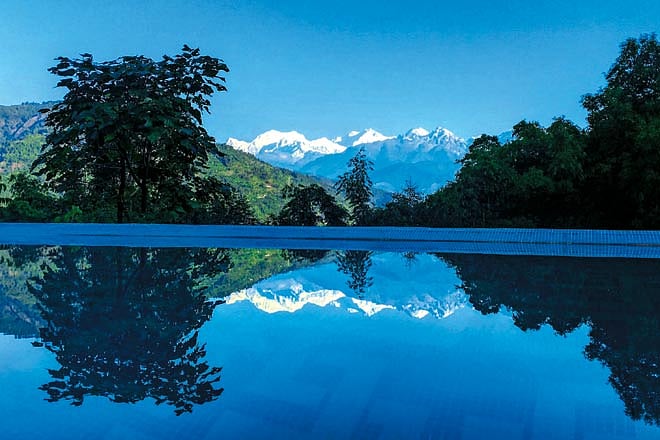 This is a beautifully maintained, warmly hospitable and genuinely heritage farmhouse that welcomes visitors to an authentic experience of a remote and stunningly beautiful part of western Sikkim. Biksthang, they say, is derived from the Lepcha word bik mon (&lsquothe place where a tiger ate a cow&rsquo). The pristine wilderness and crystal clear air at 4,100ft (pollution isn&rsquot known around here, of course) makes birdwatching particularly rewarding. The Sharkahlon family, which owns the homestead, has been settled here for 14 generations&mdash ancestor Sharkahlon Tshering Thondup, who built the original house (it still stands), was an important minister in the 18th century, the period to which the property dates. Today, the main floor serves as the reception and every modern comfort is available to weary travellers. Villagers provide most of what the resort requires, and local people are employed here. There&rsquos healthful organic food and drink to be had (do imbibe the generously offered chhang), and the farmer over at the opposite hill can be seen following the same soil revival practices for his harvests of fruits and vegetables as he has done for years. Don&rsquot miss the traditional stone baths of Sikkim here for they are a truly relaxing experience, especially if you have been travelling over Sikkim&rsquos roads for long hours before arriving. The upkeep is particularly admirable&mdashthe seven suites and rooms are aesthetically pleasing (though they can get a tad drafty in winter). Unforgettably, the dining area has magnificent views of the Khangchendzonga.