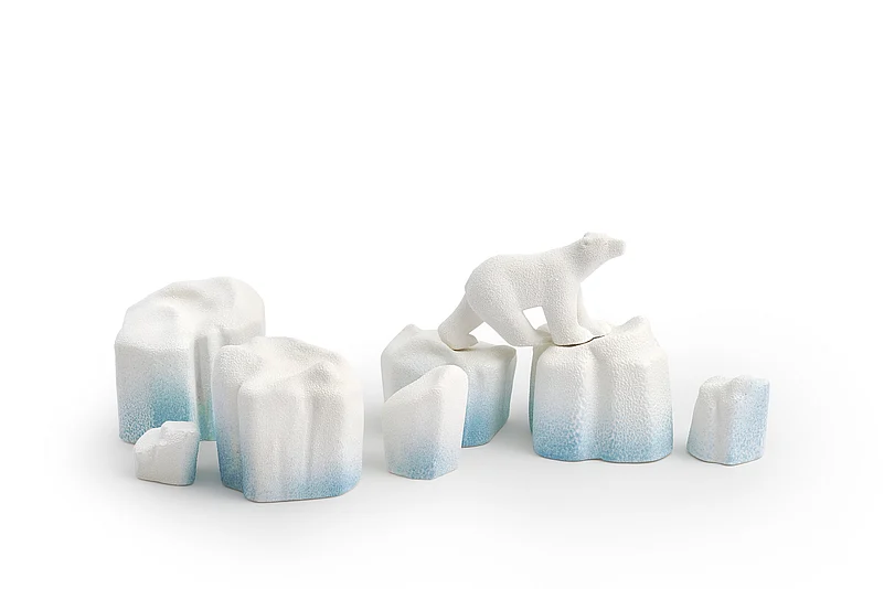 For his 2022 creation, Pascal Hainigue has eschewed the usual dominance of dark or milk chocolate for a dessert elaborated in pure white. Sculpted with the help of moulds handmade by the chef himself for the occasion, the yule log cake depicts seven individually shaped icebergs and a polar bear gingerly traversing them. Like an Arctic scene frozen in time, the sculptural cake is as light as it is original. Each large iceberg segment is developed in 3 delicate dacquoise layers featuring hazelnut and chestnut meringue, a sweet chestnut cream filling and calamansi jelly for a delicious hint of tangy citrus. The miniature icebergs are crafted from a smooth base of hazelnut praline.