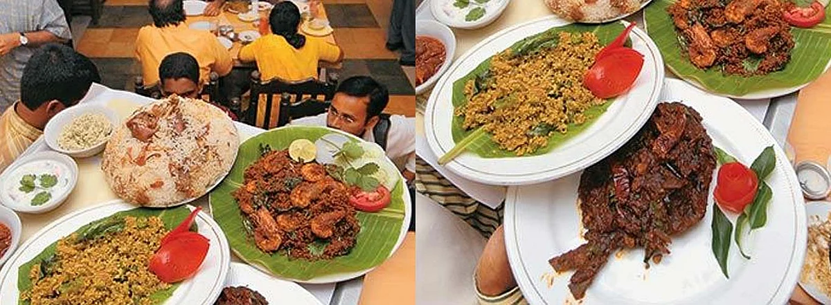 Her husband and partner, Noor Mohammed, an Afghan who once played football for Kerala, takes me through the day&rsquos specials, most of which customers can check out in a glass cabinet in the restaurant &mdash a good thing for visitors, since the menu is entirely in Malayalam. There&rsquos the wonderfully fragrant prawn and chicken biriyani kozhi adachitathu (whole chicken stuffed with eggs) which is half-cooked in masala, then fried, before being returned to the masala the wonderful meen pathiri, a rice-based bread this time, steamed in plantain leaves with a fried fish and savoury stuffing and, to finish with, unnakai, made from mashed boiled bananas, mixed with eggs, sugar, nuts and raisins before being deep fried, and chattipathiri, a savoury dessert made of refined flour pathiris layered with a mixture of beaten eggs, cardamom and sugar, with cashew, poppy seeds and raisins added.