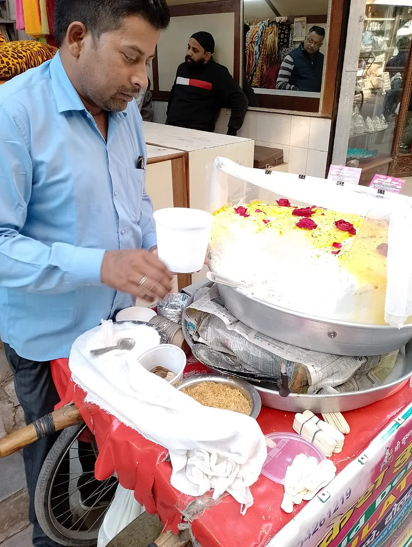 Another famed seller of the dessert, Hemchandra, sets up shop in Chawri bazaar. Taste the kewra and jaggery accented flavours of his foamy sweet while browsing the silver market.