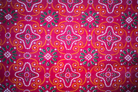 This distinctive tie-and-dye work is characterised by patterns on vibrant backgrounds, created by pinching and pushing small portions of the fabric into small points, and knotting and twisting them with the help of thread. The fabric is then dyed in different shades of colour, thereby leaving the knotted parts uncoloured.