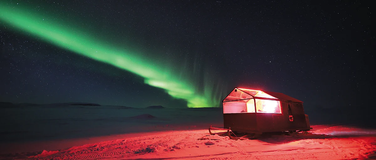 Aurora borealis. The dance of these vivid red and green lights in the northern sky, their reflection on sparkling white snowfieldsthe experience has no parallel. Alas, that cumbersome chase at an ungodly hour once they have been spotted, only to have them disappear by the time you reach, isnt fair Which is what makes the new Aurora Wilderness Camp a great idea. It is a slightly bizarre, slightly fascinating accommodation offered by an Englandbased tour operator, Off the Map Travel, where two mobile log chalets, placed on top of sleds, are dragged to the best vantage points at the beginning of each aurora season. They have glass roofs for an uninterrupted view of the sky, and are parked in isolated places, great for privacy. You could spot the Northern Lights while snuggling in your bed, relaxing in the outdoor hot tub, grilling sausages on the campfire or even riding on a snowmobile along the tundra. The double-sharing cabin is offered along with a four-day full-board itinerary (from 3,198 doubles, including transfers, activities and a guide). This season, Aurora Wilderness Camp is positioned six kilometres from Kilpisjrvi in Finland.