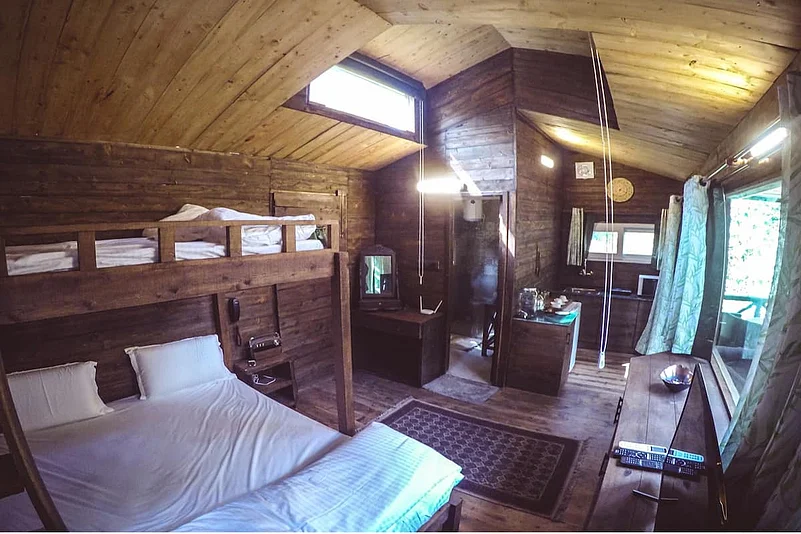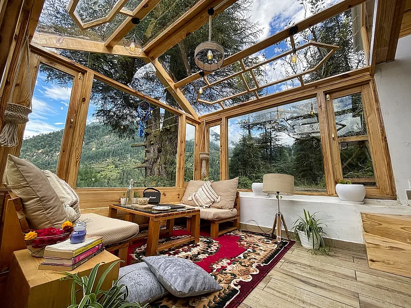 Make this cabin on a mountain top in Himachal Pradesh for a few days if you are a nature lover. And what&rsquos more, they also welcome pets. The A-frame cabin with a living area topped by a glass roof allows you to enjoy spectacular views by day and night. Located in Jari village, less than 20km from Kullu town. You may prepare your own meal at the kitchen or choose from the menu provided by the host. Can accommodate six guests.