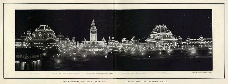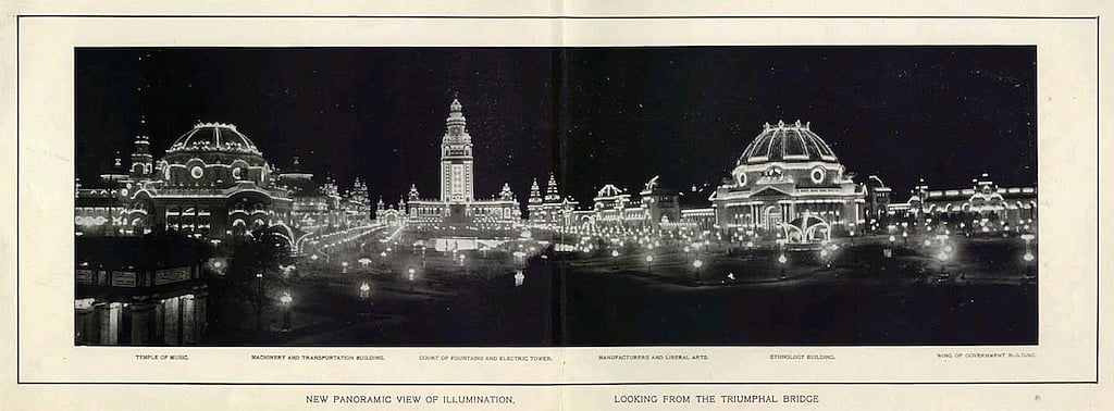 A glittering panorama of the Pan-American Exposition in Buffalo, New York. Held from May 1 to November 2 in 1901, this world&rsquos fair was lit up by Thomas A. Edison Inc. (yes, that Edison) after the advent of the alternating current in the United States. The fair drew around eight million visitors as a showcase of commercial joys (including the then newly-developed X-ray) and western solidarity, and was built for a whopping $211 million (2018 equivalent).